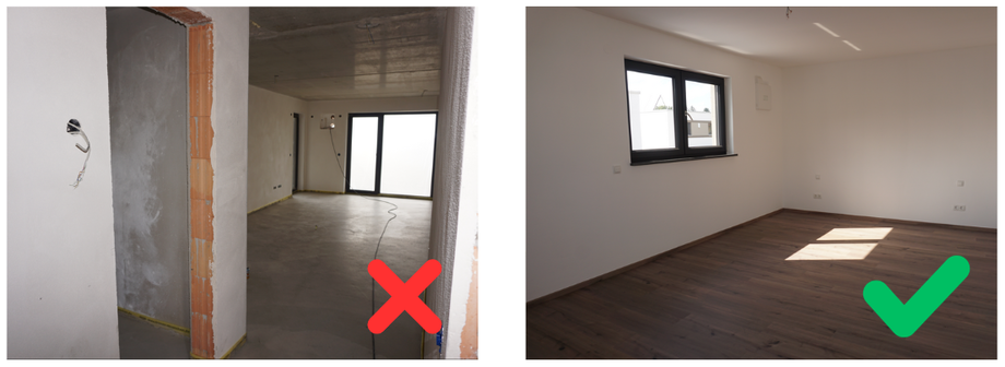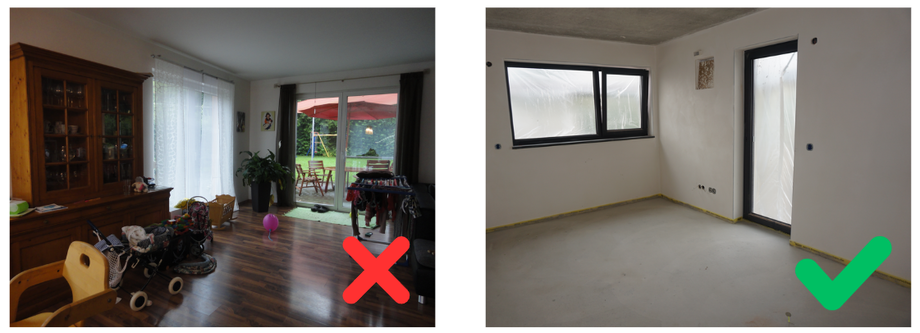 🏠 Beispiel: Wenn der Boden im Schatten liegt oder die Wände nicht sichtbar sind, kann das Ergebnis uneinheitlich wirken. Ebenfalls schwierig sind Wandvorsprünge oder mehrere offene Türen oder Durchgänge.