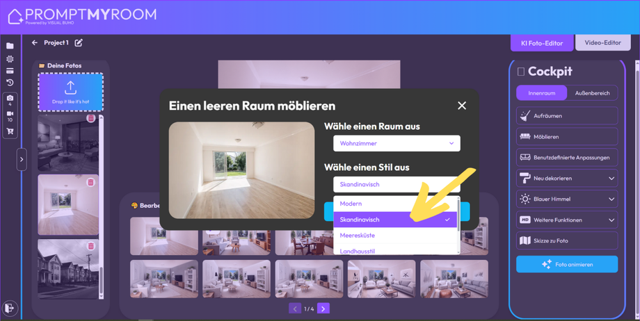 Wenn du z. B. einen Rohbau hochlädst, wird die KI den Rohbau möblieren – nicht verschönern