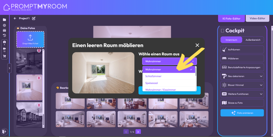 Mit der Funktion „Möblieren“ kannst du einen unmöblierten Raum automatisch und stilvoll virtuell einrichten lassen.