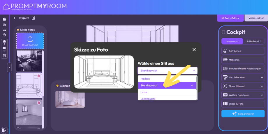 Mit der Funktion „Skizze zu Foto“ verwandelst du einfache Skizzen, Grundrisse oder CAD-Ansichten in realistische, fotorealistische Darstellungen – in nur wenigen Sekunden.